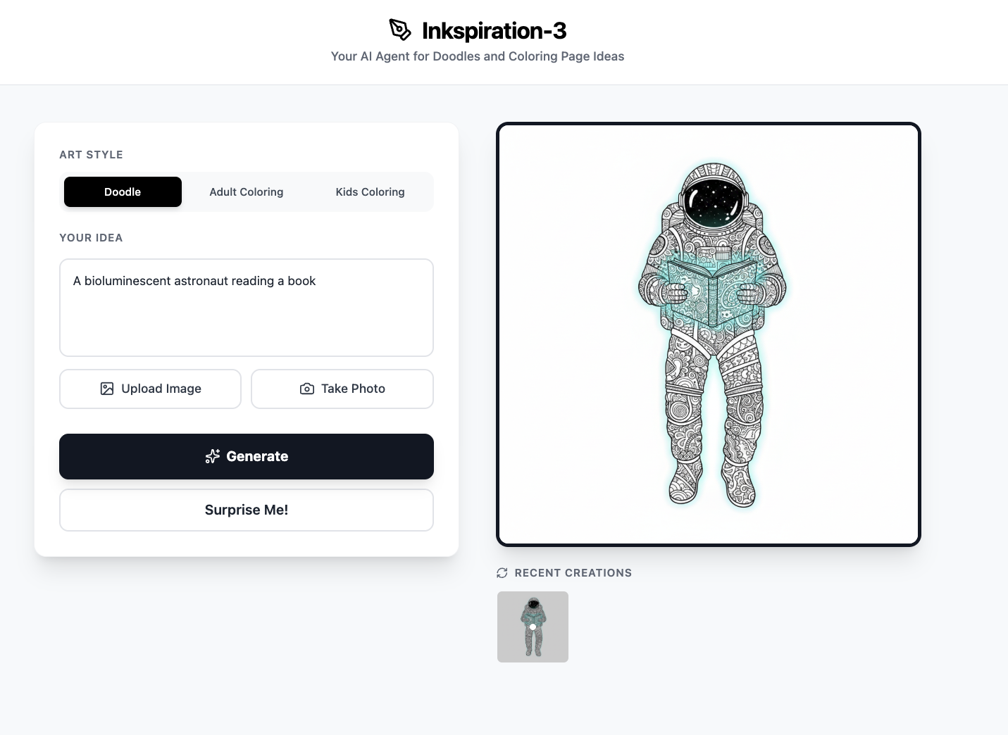 Your personal AI assistant for creativity. Convert simple ideas, or a photo into unique, intricate black-and-white zentangle/doodles or adult coloring pages